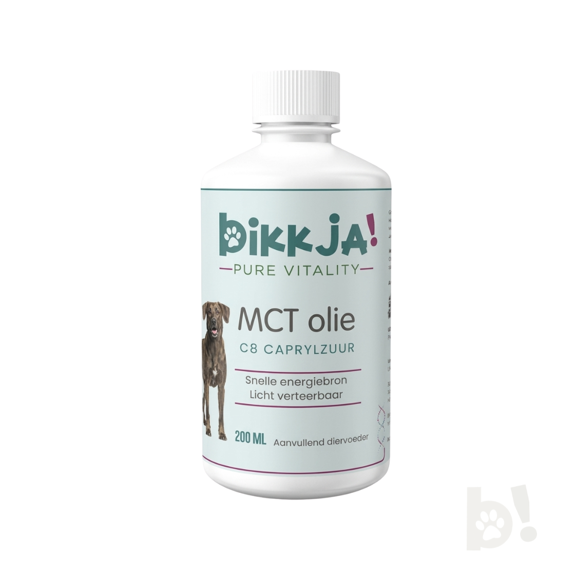 MCT-olie (Medium Chain Triglycerides) is een natuurlijk vetzuur, afkomstig van kokos, dat snel wordt opgenomen en gebruikt als snelle energiebron. Voor honden kan het een waardevolle aanvulling zijn op de dagelijkse voeding, vooral bij verminderde eetlust of verhoogde energiebehoeften zoals bij oudere honden of actieve honden. Kan bij oudere honden de cognitieve functie ondersteunen.